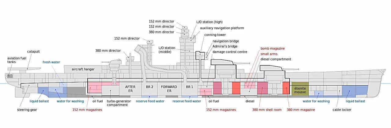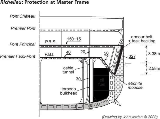 黎塞留级战列舰内部结构示意图,他的燃油舱是防雷系统中重要的一部分