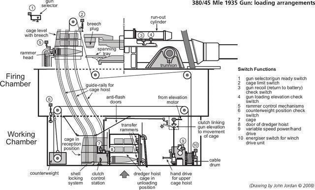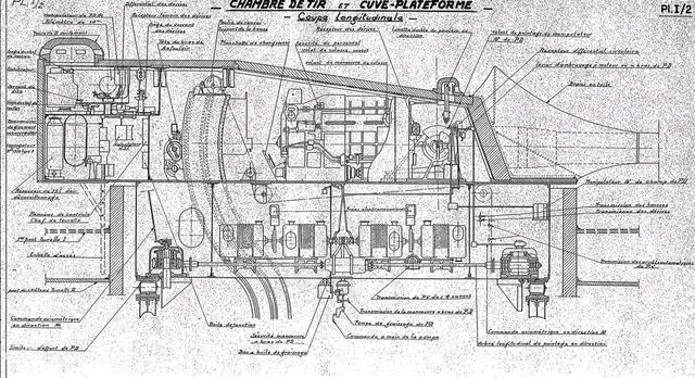 黎塞留级战列舰主炮炮塔的结构非常独特。在每座四联装炮塔内部,都有一道45毫米厚的装甲纵壁,将每侧的2门主炮隔开。不仅如此,两组主炮的炮室与测距仪室也用防火防破片隔板分隔。他们甚至还有独立的弹药库与扬弹机。