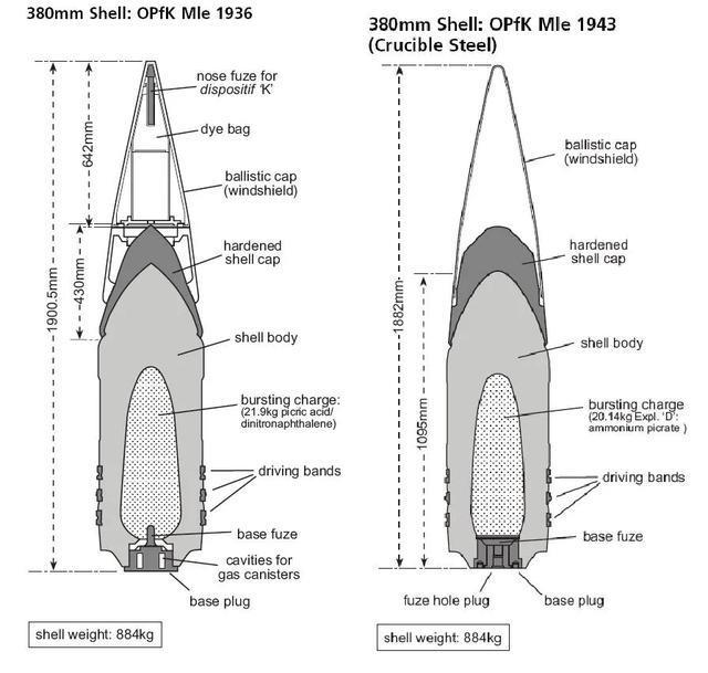 尽管这两种穿甲弹的弹重都是884千克,但他们两者之间还是有着很大的差异的。法制的穿甲弹长1900.5毫米,(要知道美军装备的Mk8超重弹也仅仅有1820毫米长)这样修长的弹型使他可以拥有比其他穿甲弹更远更稳定的弹道。