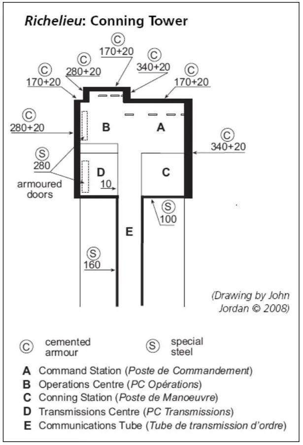 黎塞留级战列舰的指挥塔正面装甲厚340毫米,背面装甲280毫米。两侧装甲厚280毫米,顶部装甲170毫米,底部装甲100毫米。其中在指挥塔的正面、顶部、背面装甲后还有20毫米的防崩落背板。通信桶也有160毫米装甲的保护。