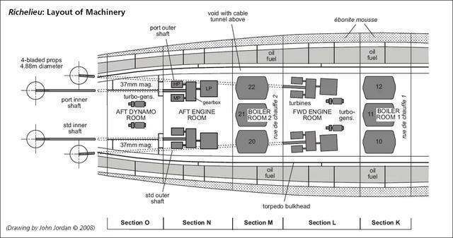 在2层防雷壁后,是黎塞留级战列舰的燃油舱。这间舱室深度达3.42米,可以大大降低鱼雷爆炸的冲击力。在燃油舱的后方还有一道10毫米厚的防雷壁,最后还有一层30毫米的主防雷壁。他与10毫米的防雷壁之间还有1.2米的空舱。