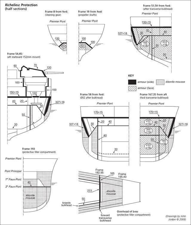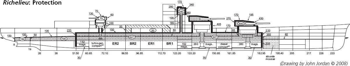 除此之外,黎塞留级战列舰还采用了双层舰底设计。其中下层舰底厚26毫米,上层舰底厚11毫米,弹药舱的下方还加装了1层30毫米厚的第三层舰底。总的来说,黎塞留级的水下防护能力非常优秀,可以抵御500千克TNT的打击。