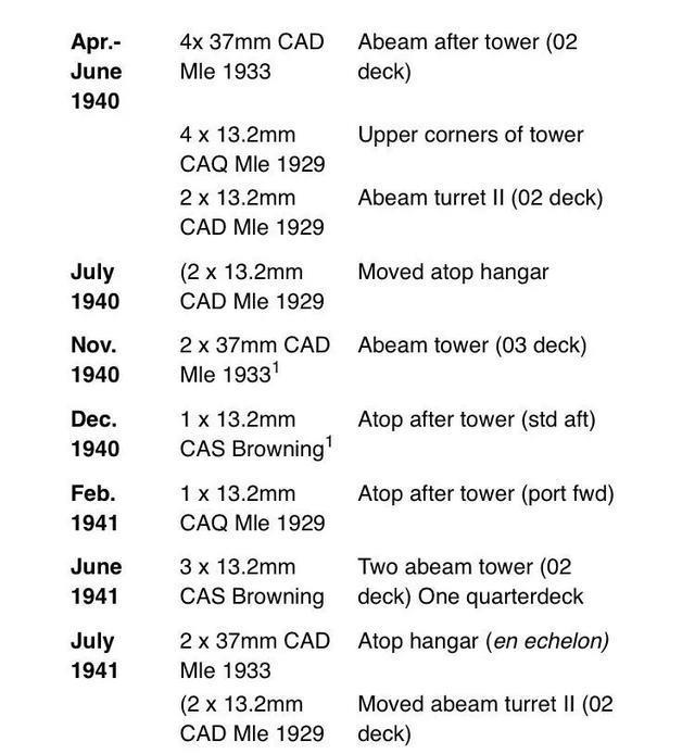 尽管四联装13.2毫米机枪虽然射速较高,但是这种武器的威力太小,无法对敌机造成什么致命的伤害。在接下来的一段时间里(黎塞留号加入美军前),法军又多次加强了黎塞留级战列舰的防空火力,具体情况请看下面的表格内容。