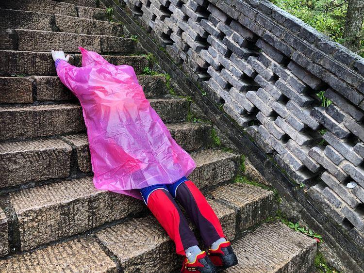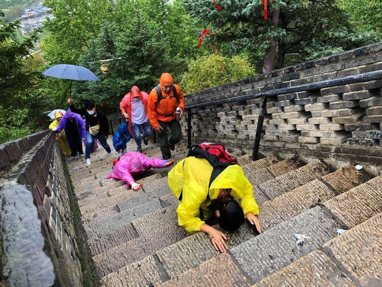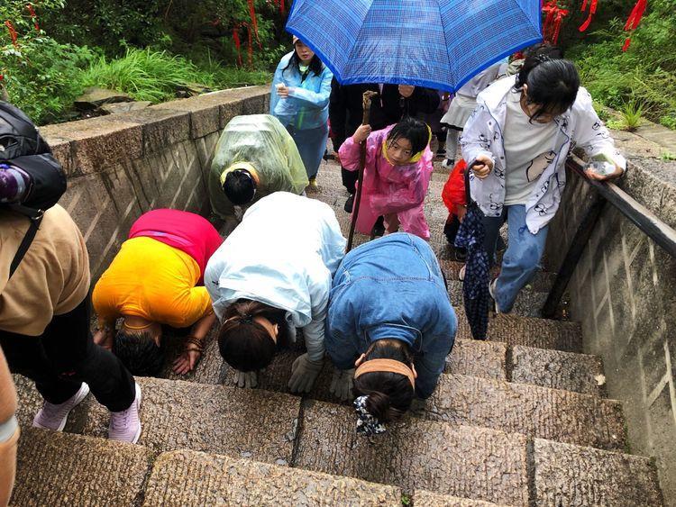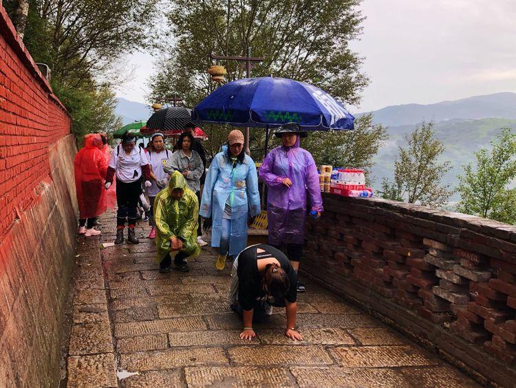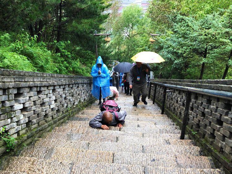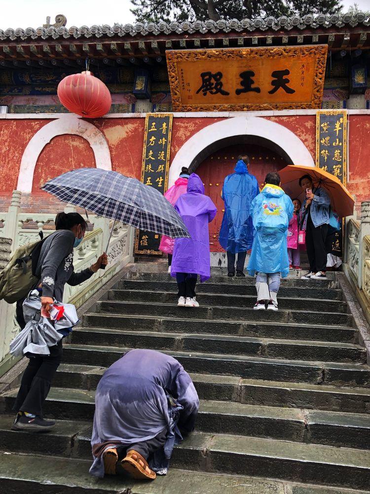 他们的登顶不像我踏阶而上,而是三步一叩,就是上三个台阶跪下去五体投地拜上一拜,1080个台阶下来就是360拜。