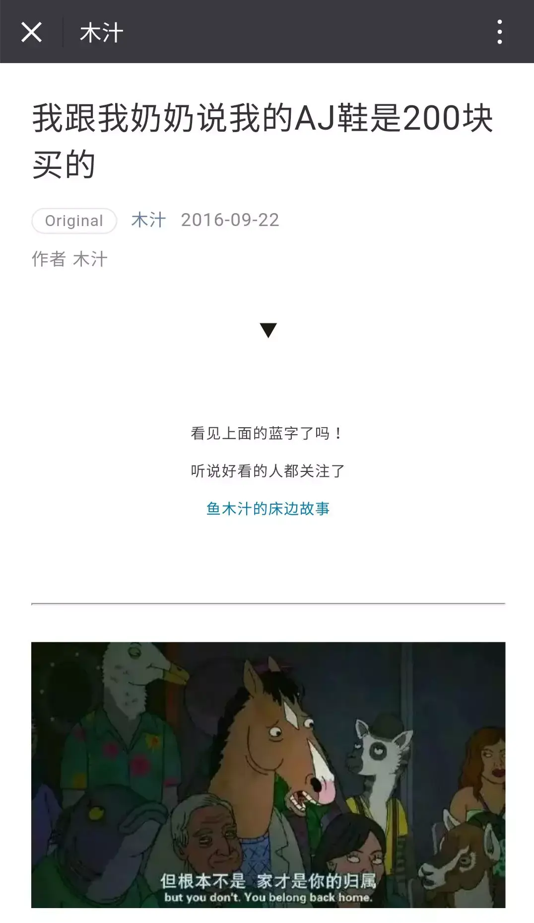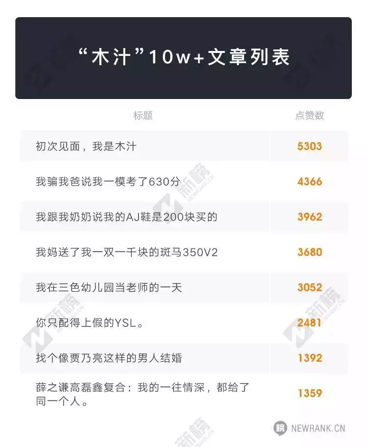 2016年9月,木汁的第一篇原创10W+《我跟我奶奶说我的AJ鞋是200块买的》,刷屏各个平台,为木汁带来2万多新增粉丝,现在的累积阅读量早已破百万。