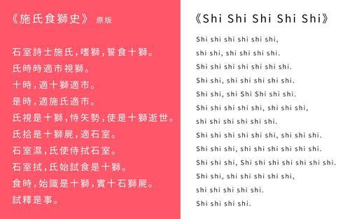 石(shí)室(shì)诗(shī)士(shì)施(shī)氏(shì),嗜(shì)狮(shī),誓(shì)食(shí)十(shí)狮(shī)。
