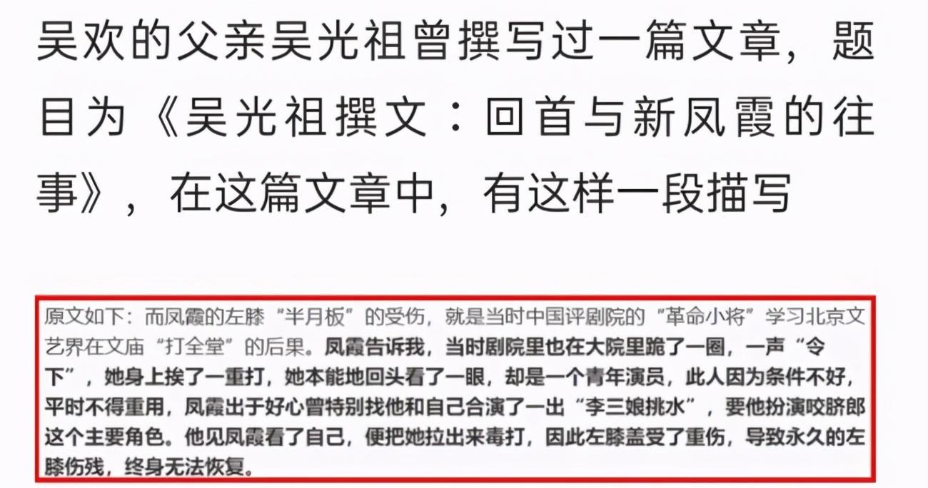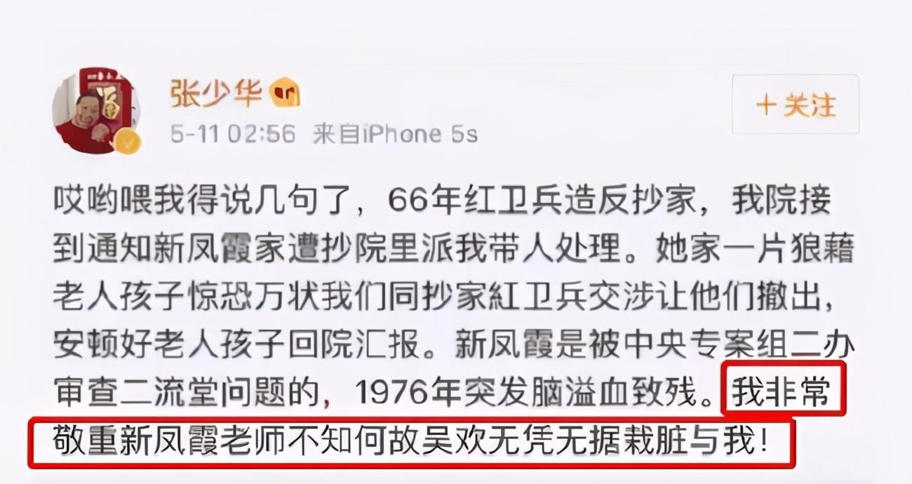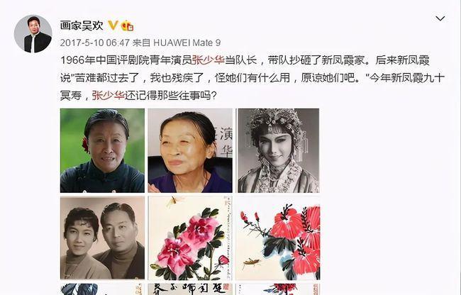 在吴欢的文章中,他直接点名张少华,称其在1966年,带队抄了新凤霞的家,并指挥他人将新凤霞打成残疾,毁掉了她的下半生。