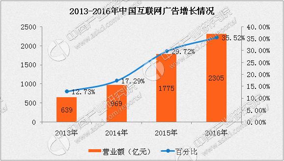 根据中国广告协会互动网络分会发布的数据显示,互联网媒体广告收入持续增长,2015年中国互联网广告经营额达1,775亿元,首次超过电视媒体广告收入。2016年中国互联网广告经营额达到了2,305亿元,继续呈现快速增长势头。