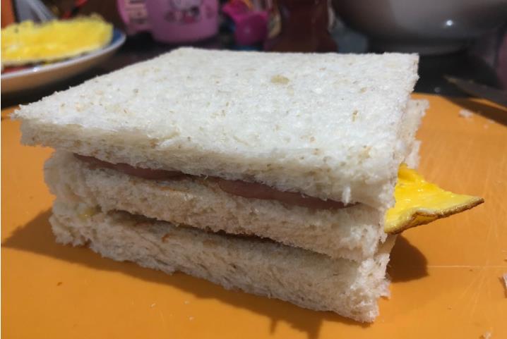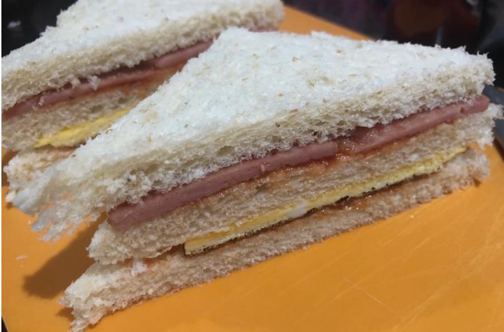 8、斜着刀切开就可以了。三明治的做法有非常的多,我这个就属于是比较经典的做法,放了午餐肉还有鸡蛋。大家有喜欢吃什么蔬菜水果的,还可以放生菜或者西红柿在三明治里面,口感都非常丰富的。我喜欢吃三明治也是因为它比较多变,今天吃个经典的加了鸡蛋跟火腿的,明天就可以换成放了蔬菜的,都一样好吃美味,关键是还简单。