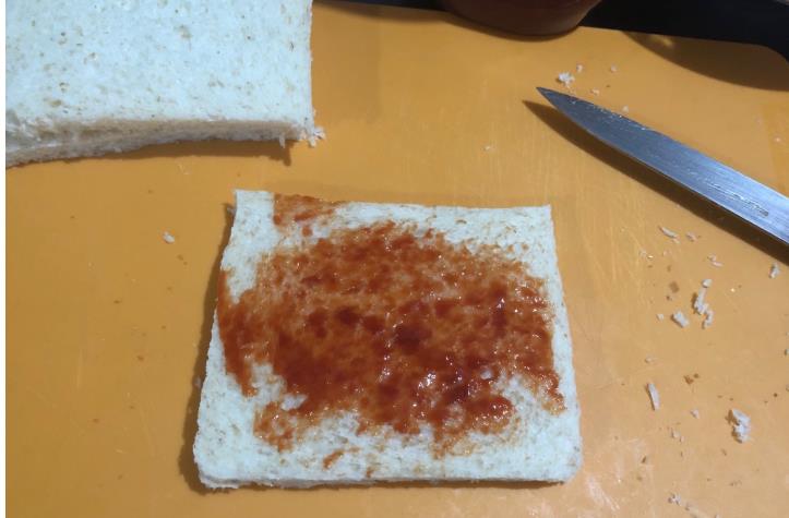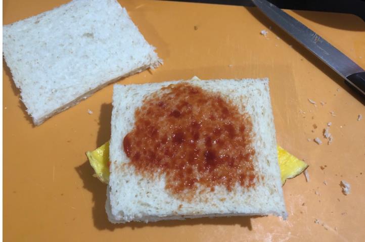 5、再盖上一片吐司,在上面依旧涂上番茄酱。