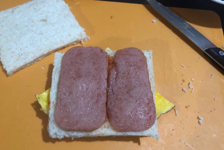 6、在上面放上2片煎好的午餐肉。