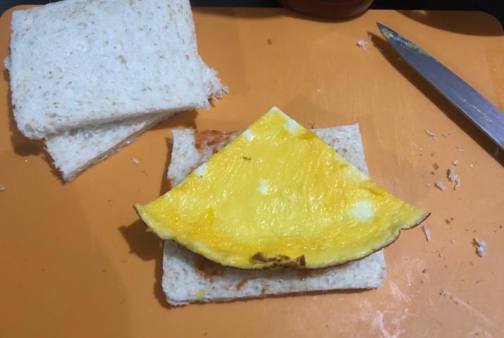 4、取出来其中的一片吐司,在当面涂上番茄酱,尽量涂的均匀一点。大家有喜欢其它口味的酱都可以,比如沙拉酱,黑胡椒酱,蛋黄酱等等。煎好的鸡蛋切下来一块放在上面。