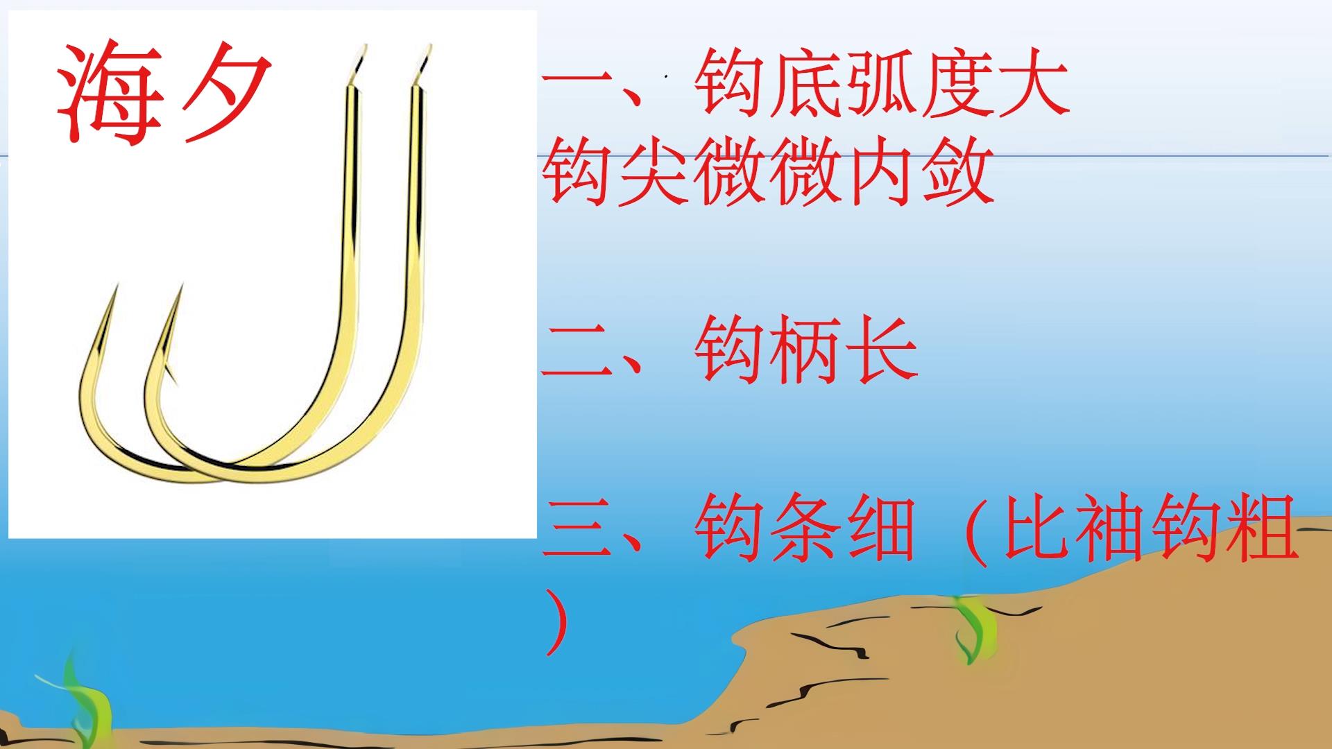 第一种海夕。其特点是钩底弧度大、钩尖微微内敛、钩柄长、钩条细(比袖钩粗)。从这些你就可以看出它和袖钩一样,都可以用来钓小鱼,但是其结构强度明显要大上许多,综合性能也更强一点,通常是用在鲤鱼、鲫鱼通杀上。比如说我是主钓鲫鱼,但是这个窝点偶尔会来一些鲤鱼,那用海夕3号或是海夕4号进行通杀就是不错的选择,鲫鱼也可以钓,鲤鱼来了也有一战之力。