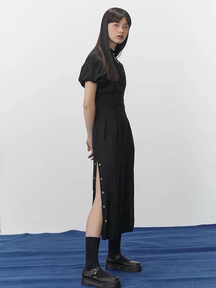 旗袍也能穿出英气感?是的,没错!想要打造这类风格的话,首选就是黑色的改良版旗袍,穿上会显得整个人又甜又飒。而且黑色的单品最能显瘦,旗袍最讲究的就是腰部线条的流畅,所以,对身材不太自信的姐妹们,首选黑色旗袍准不会出差错。面料上可以选择丝绸的材质,比较滑顺而且透气,最适合闷热的夏天,镶嵌一颗红色玛瑙的领口,起到一个画龙点睛的作用,日常穿也不会过分招摇,反而有一种低调的高级感。