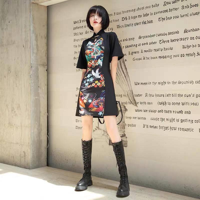 若是比较想彰显个性的姐妹,可以选择复杂风格的,因为是黑色打底,改良旗袍可以接受所有的花里胡哨,怎么搭配都不会显得俗气。