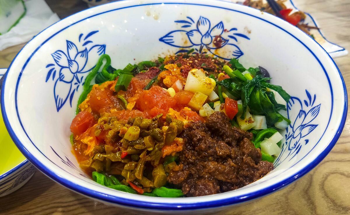 4.将面捞入碗中,撒上葱花、素臊子(土豆、豆角、胡萝卜食材切丁,入锅炒断生或者开水锅里煮断生,加盐调味即可。),浇上调制好的酸汤,美味即成。