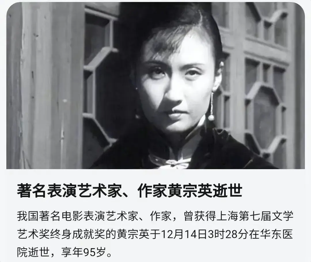 2020年,12月14日,著名表演艺术家、作家黄宗英逝世,享年95岁。