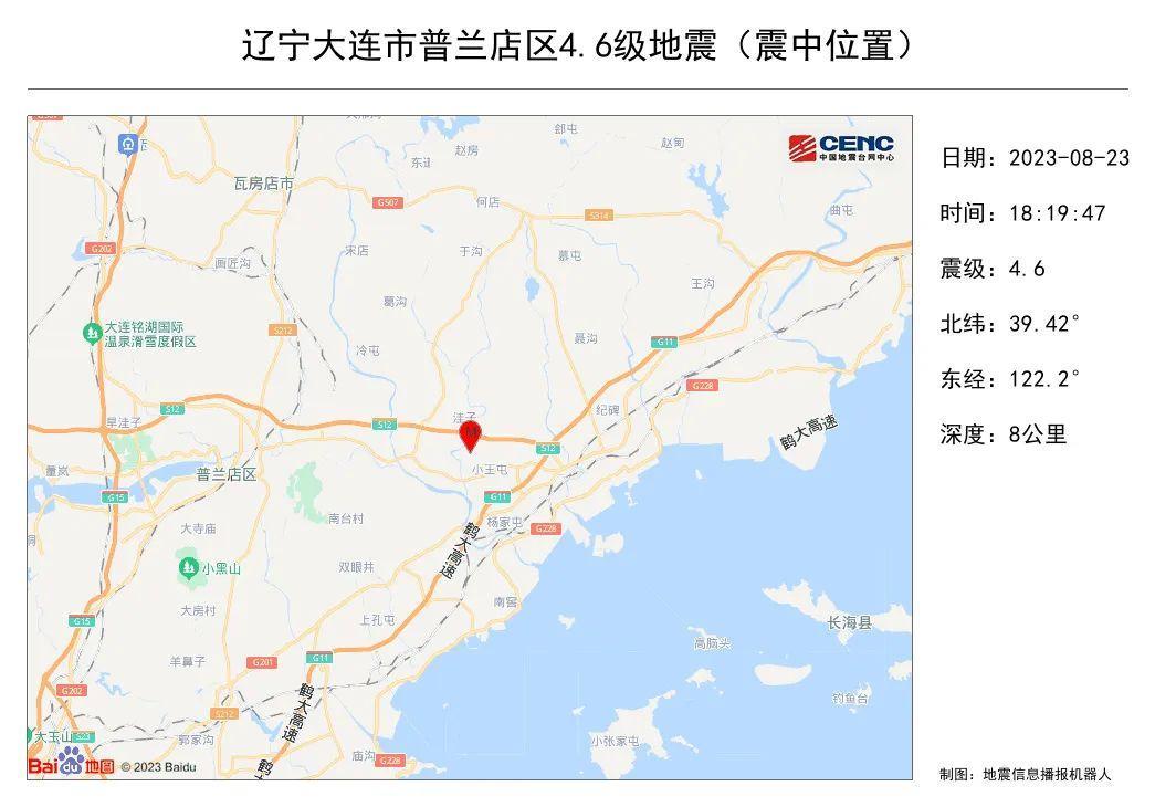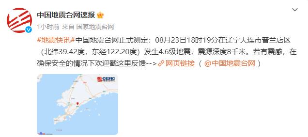 据中国地震台网正式测定,8月23日18时19分在辽宁大连市普兰店区(北纬39.42度,东经122.20度)发生4.6级地震,震源深度8公里,震中位于北纬39.42度,东经122.20度。