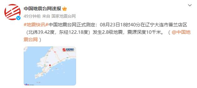 中国地震台网正式测定:8月23日18时40分在辽宁大连市普兰店区(北纬39.42度,东经122.18度)发生2.8级地震,震源深度10千米。