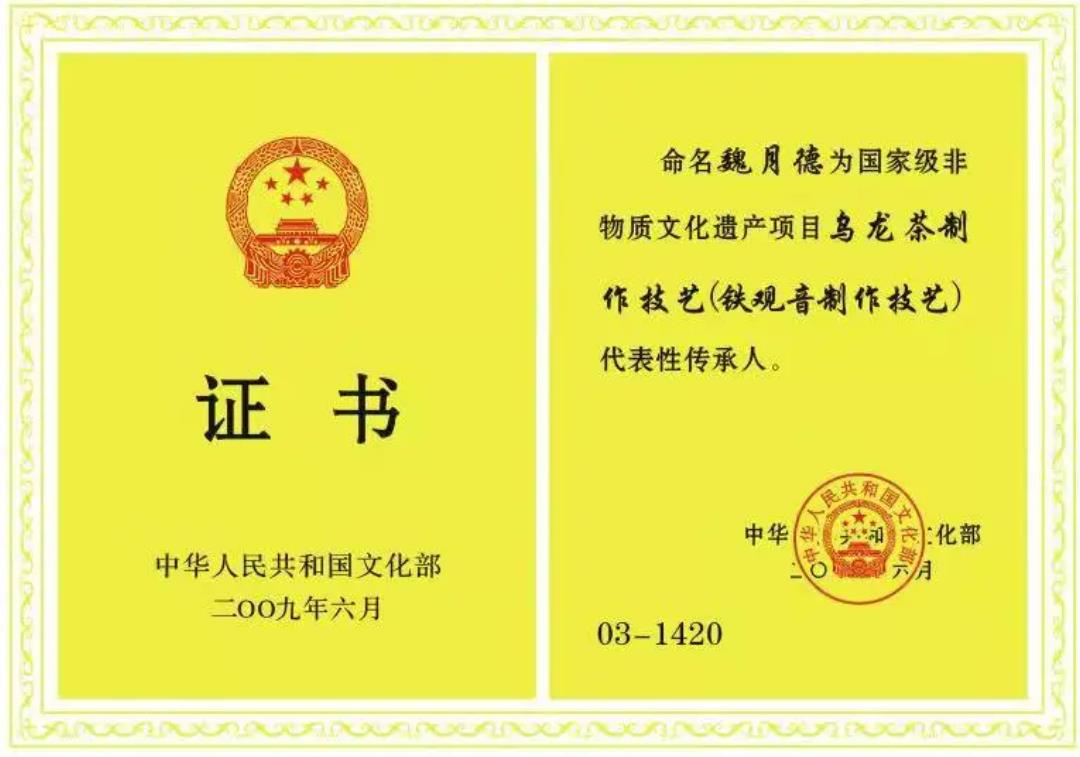 2008年,乌龙茶(铁观音)传统制作技艺被确定为国家级非物质文化遗产,魏月德获得传承人称号。
