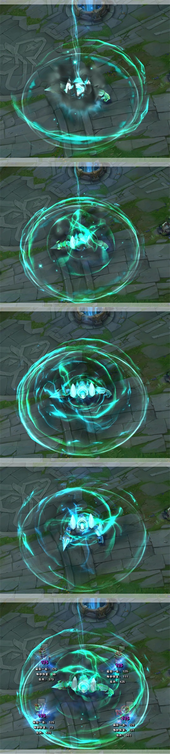【R被动】:升级R技能后,身体就会被一层青绿色电光护体保护。而且身上的一些纹路或者说身上的缝隙(水口)更合适,这时也会点亮为青绿色。表现出能量过载的现象,这两种颜色的搭配非常简约且高级