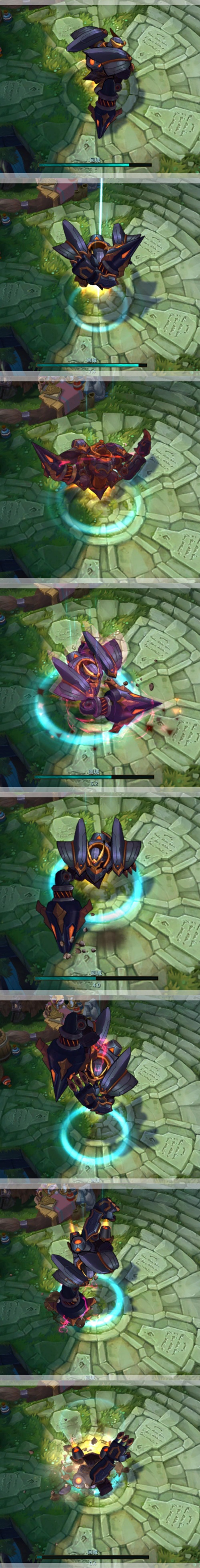 【W】:W技能开启,移动的途中,带钩子那只手会加速旋转,到最高转速时会出现电光。这款皮肤加速后的尾焰玫红色的,非常漂亮