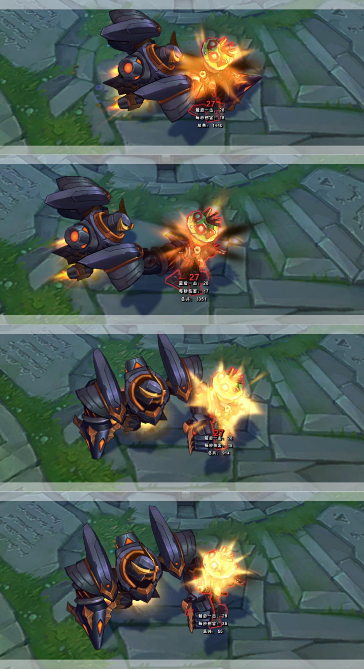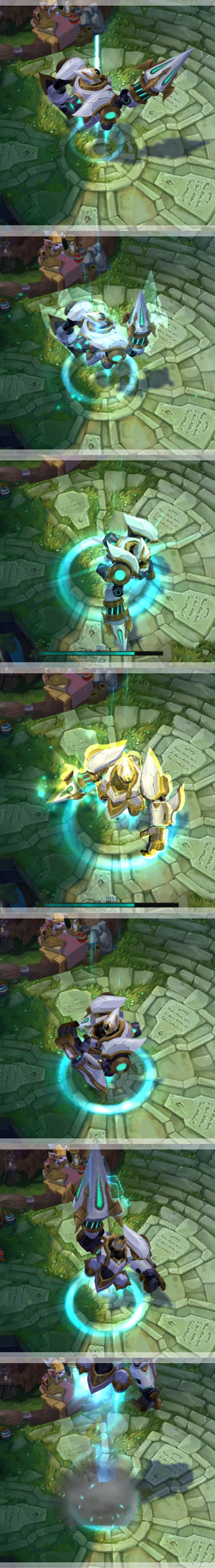 【R被动】:升级R技能后,身体就会被一层棕色电光护体保护。而且身上缝隙(水口)这时也会点亮为棕色。表现出能量过载的现象,这两种颜色的搭配比银白来得更显霸气和威严,肃杀感十足