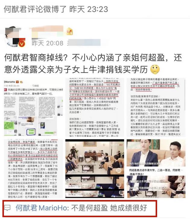 那番言论简直是明示赌王为子女上牛津捐钱买学历,被网友指责其"智商掉线"。而八百倍速网上冲浪的何猷君冲刺在爆料和澄清的第一线,直接在对方评论区回复不是同母胞姐何超盈。