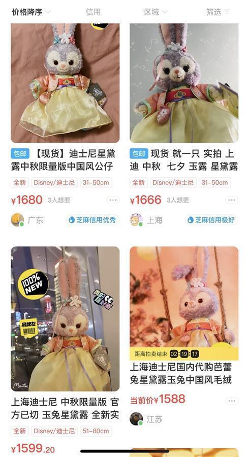 七夕前,在一些网络二手平台上,它的标价普遍达到800元上下,甚至还有一些卖家挂出超千元的天价。只因为它不是一般的兔子玩具,而是迪士尼最新推出的中秋款星黛露“玉兔”——原价359元。