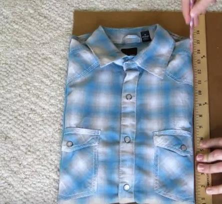 2、将叠好的衬衣放在纸板上,用直尺量好尺寸,用铅笔坐好标记