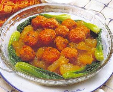 主要食材和烹饪方法:金陵丸子是南京的传统名菜,属于金陵菜系,是金陵菜的代表之一。主要食材为猪肉,通常选用猪肉剁成肉茸作为主要原料。制作金陵丸子时,将剁好的猪肉加入适量的调料和淀粉,搅拌均匀后制成丸子形状。制作过程中,丸子可选择水煮、炖煮或者炸制等不同的烹饪方法。