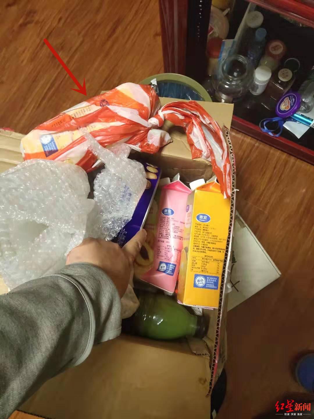 拆箱时有一盒橙汁用红白相间塑料袋包裹着(箭头所指)