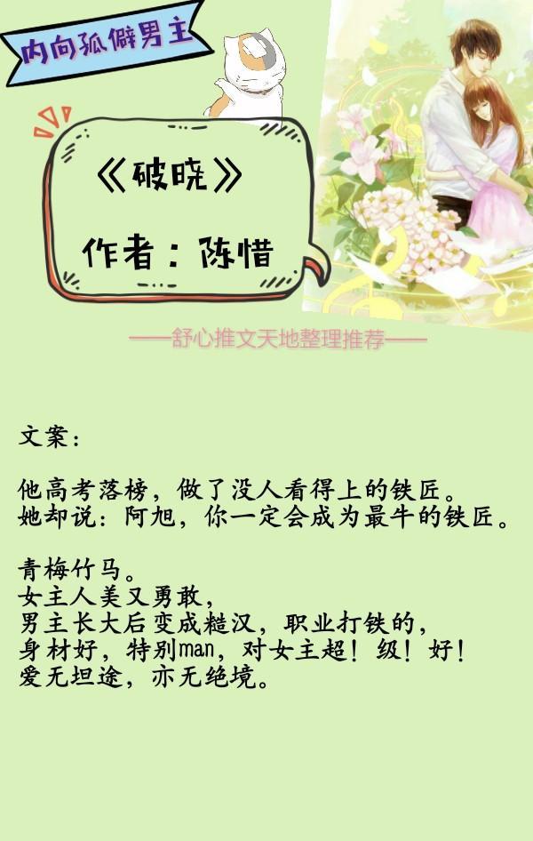 书评:双向暗恋文。女主和男主青梅竹马。男主由于家庭原因一直孤僻冷淡,是女主给了他温暖。男主糙汉子,因为缺考放弃了大学,后来开了打铁铺生意兴隆。女主一直陪在男主身边。俩人携手面对家庭的反对等困难,后来终成眷属。整篇文都很温馨,基本无虐。
