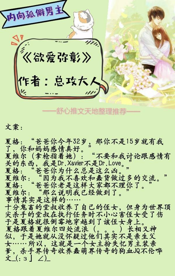 书评:这篇文是总攻大人一贯的文风,个人认为很好看。高智商顶级杀手vs巨额财产继承人。讲的是杀手夏维尔和他的堂侄女夏格(夏格是穿越过来的)的爱情。男女主是三代以外堂叔侄关系,算是有血缘关系。文里有吸血鬼狼人等设定。男主看起来是个西装革履冷酷无情英俊迷人的男神,实际有点难以沟通,人设很有魅力,1V1,结局HE。
