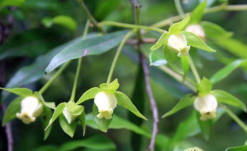 三是雄花生长在聚伞花序上,花萼4裂,花冠壶状,4裂,雄蕊16个;雌花单生,白色,芳香,花萼4深裂,花冠壶状,比花萼短,4裂,有退化雄蕊6个;通常4-5月开花,花梗长达4公分左右;