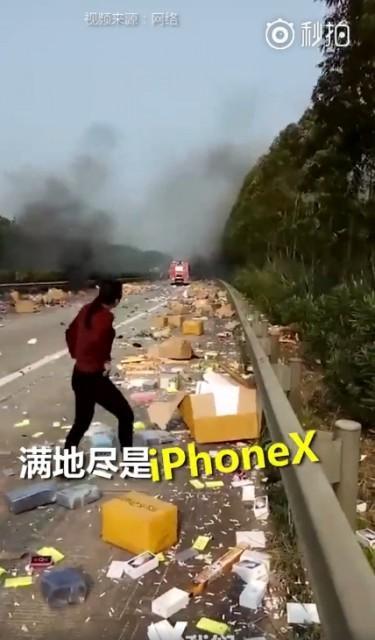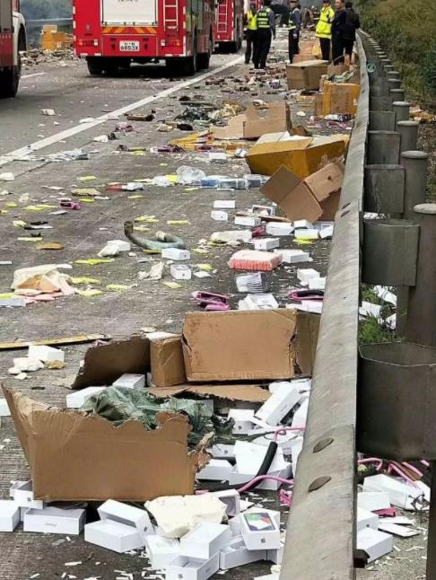 货车上装载了大量的电子产品, 发生事故后散落一地,包括大量的苹果iPhone X手机包装盒 ,十分惹眼。