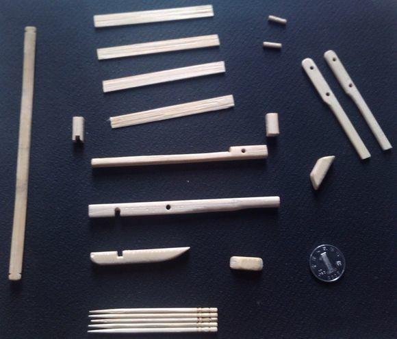制造诸葛弩的材料使用家家都有的筷子,上图是制作完成的各部件分解图,将这些零件制作完成后用502或是木工胶粘黏起来即可。