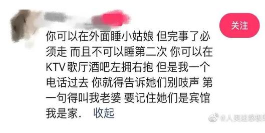 你可以在外面睡小姑娘,但完事了必须走,而且不可以睡第二次。你可以在KTV歌厅酒吧左拥右抱,但是我一个电话过去,你就得告诉她们别吱声,第一句得叫我老婆。要记住她们是宾馆,我是家。
