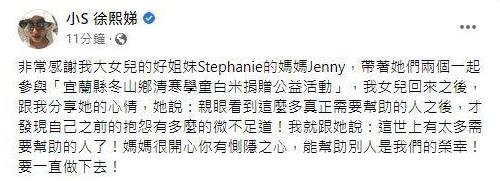 在官宣离婚以后,小S在社交平台上发布了女儿做公益的动态。