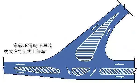 作用:导流线属禁止标线,主要用于过宽、不规则或行驶条件比较复杂的交叉路口,立体交叉的匝道口或其他特殊地点,车辆需按规定线路行驶不得压线或超线行驶,更不准车辆停放。