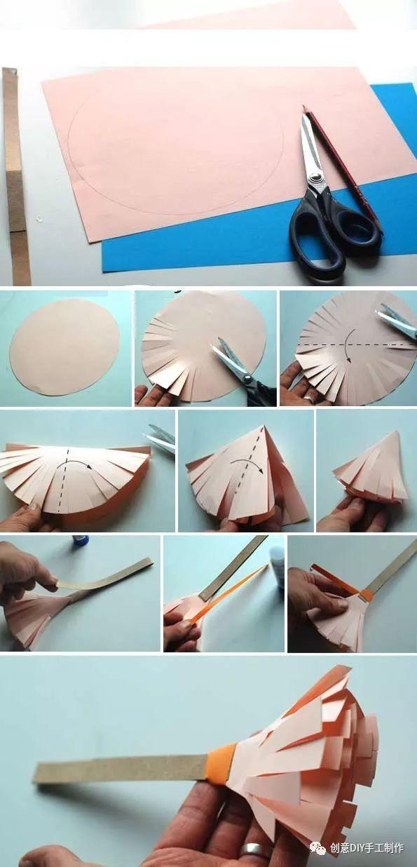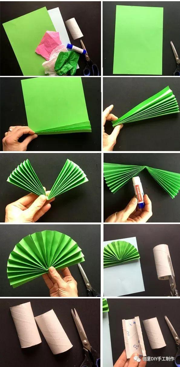 材料和工具:彩纸、手揉纸、纸筒、固体胶、剪刀