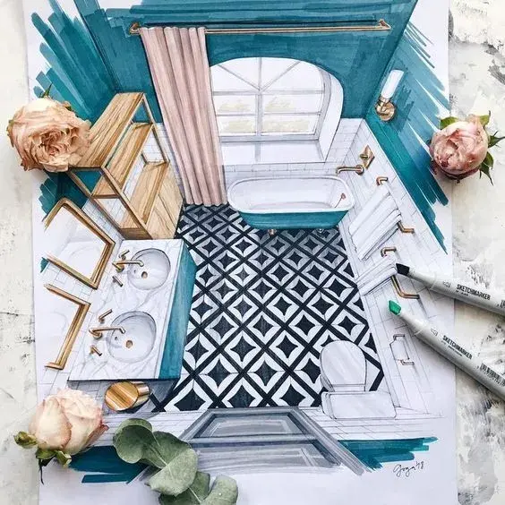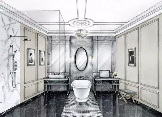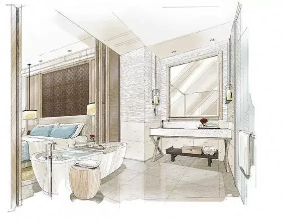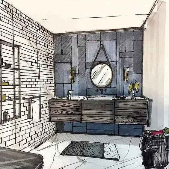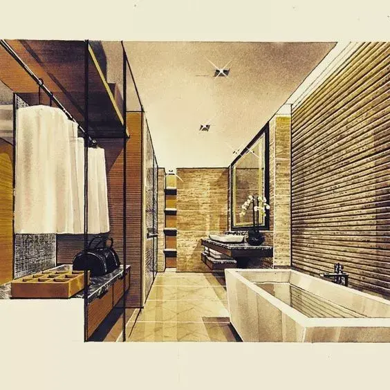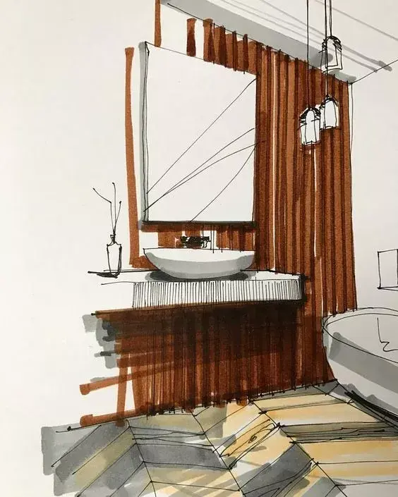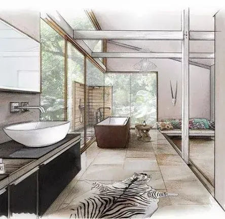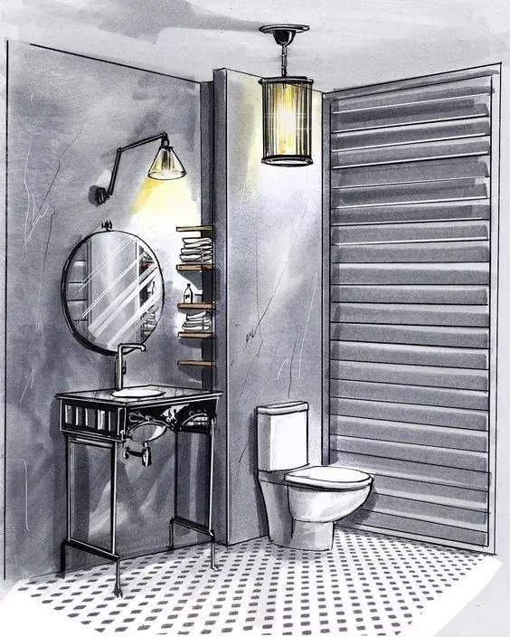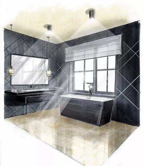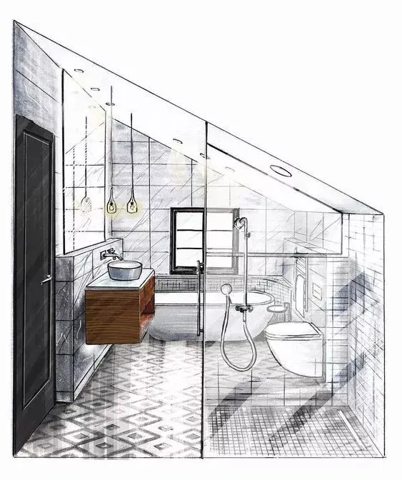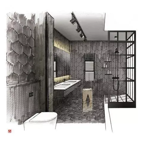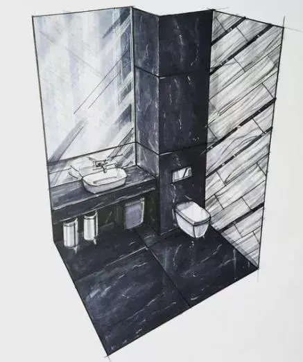 一般来说客厅餐厅空间都会用电脑效果图来表达设计,但一个卫生间因为空间小你可以用手绘的形式来表达。