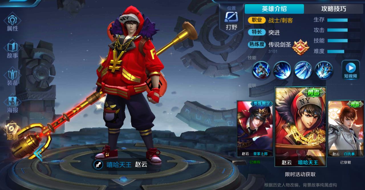 赵云的这一款嘻哈天王皮肤是一款限时活动才能获取的皮肤。之前的活动就是你在腾讯QQ客户端会和项羽的职棒王牌皮肤一起放到腾讯视频充值年费会员的活动会免费的送给大家。这款皮肤采用的嘻哈系列的风格,在游戏语音以及技能效果上都有不同的体现,总体来说还是一款很不错的皮肤。但是因为是和腾讯视频绑定的原因,所以有很多玩家可能就不想获得这一款皮肤了。不过,如果有的小伙伴实在是喜欢这一款皮肤的话还是可以关注一下这个活动,到时候进行入手的。