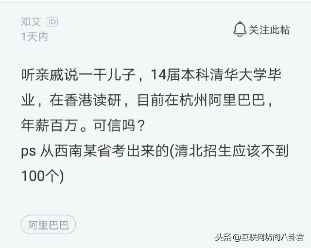 这是一名网友在匿名社区发表的帖子:听亲戚说是一干儿子,14届本科清华大学毕业,在香港读研,目前在杭州阿里巴巴年薪百万,可信吗?其还补充了这名清华毕业生的背景:从西南某省考出来的,每年录取名额应该不到100个。