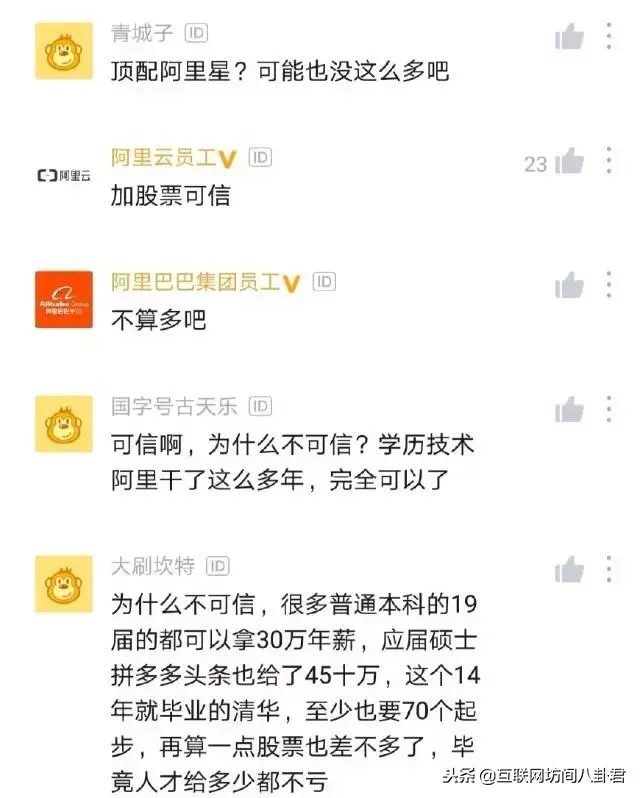 对于这样的爆料,有不少网友进行了围观并表达了不稀奇的感慨:加股票可信;可信啊,为什么不可信?学历技术阿里干了这么多年,完全可以了;为什么不可信,很多普通本科的19届的都可以拿30万年薪,应届硕士拼多多头条也给了45十万,这个14年就毕业的清华,至少也要70个起步,再算一点股票也差不多了,毕竟人才给多少都不亏;清华的也不稀奇;14年毕业的双非本科也百万;算股票的话还是很有可能得,一个优秀的人才顶100个平庸之辈,优秀人才,大公司真的很舍得给钱的。15年硕士,要是做AI 一开始就进阿里,现在7.8是有的啊。