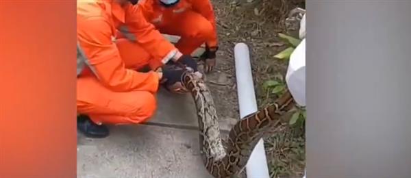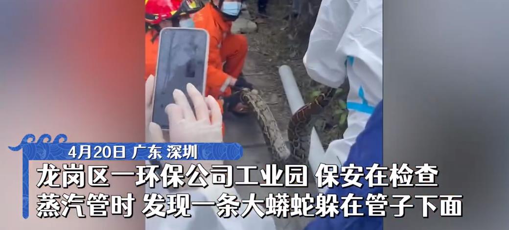 4月20日在深圳龙岗区一环保工业园,保安在检查蒸汽管道时,发现一条大蟒蛇藏身其下,吓一跳的保安立马联系专业消防人员前来处置。最终在消防员和保安的联合下,将蟒蛇抓住。