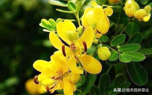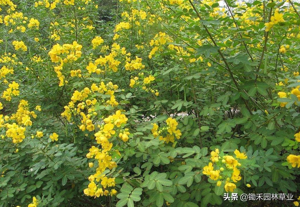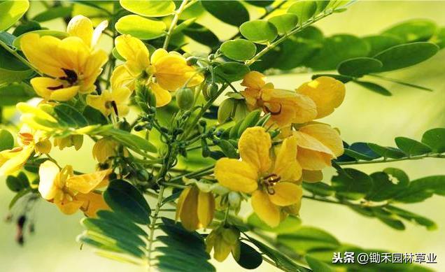 形态特征:树高1~3米,老枝灰褐色,幼枝绿色,皮孔明显。偶数羽状复叶长7~12 厘米,小叶3~5对,倒卵形或倒卵状长圆形,先端圆钝,下面粉绿色;也具有昼展夜合的特点。总状花序生于枝条顶端的叶腋,花期9~11月,花鲜黄色,单花开放6~7天。荚果细条状,长12~18 厘米,种子有光泽,圆肾形。在华南地区果熟期2月底至3月初,华东地区不结实。