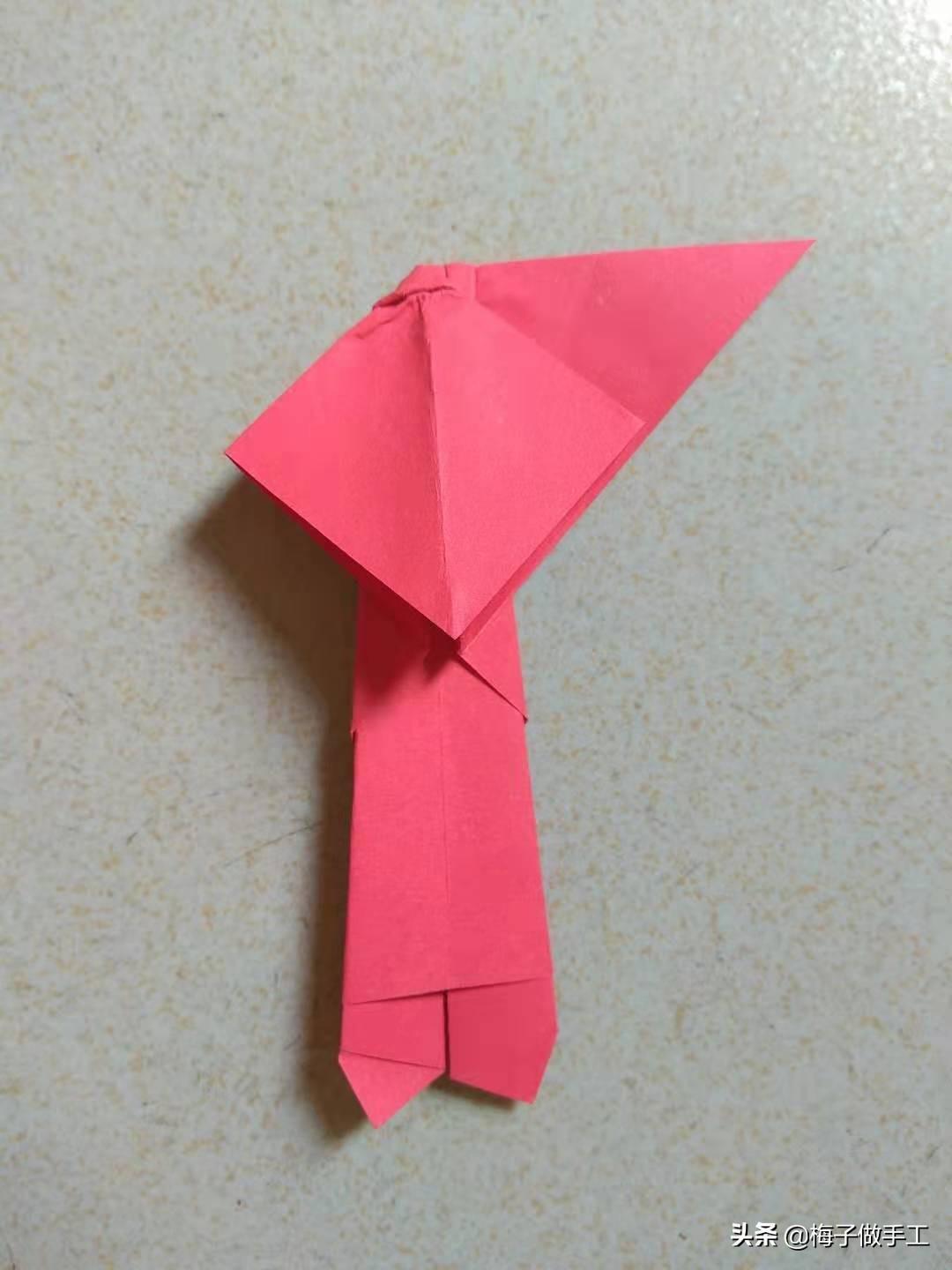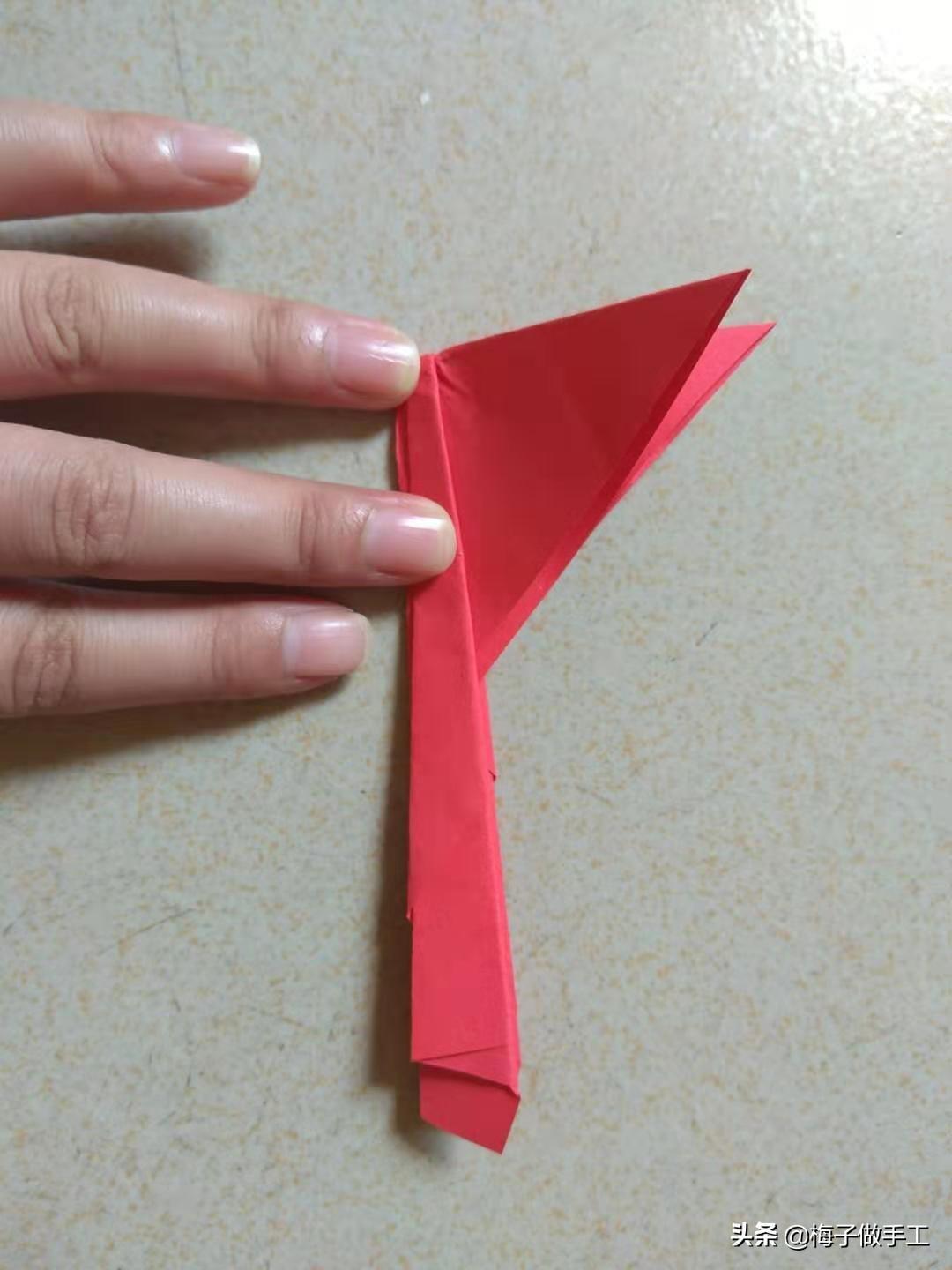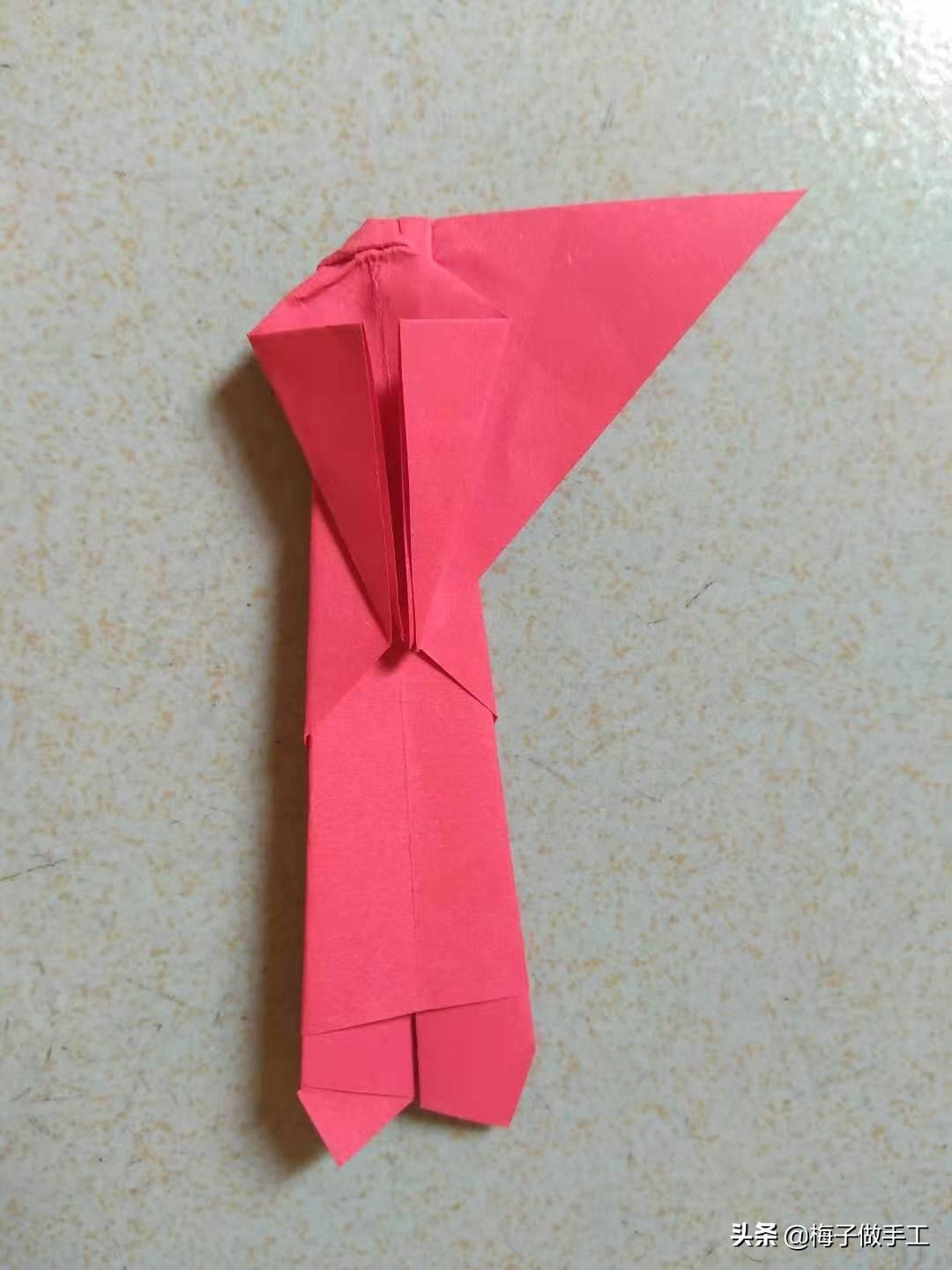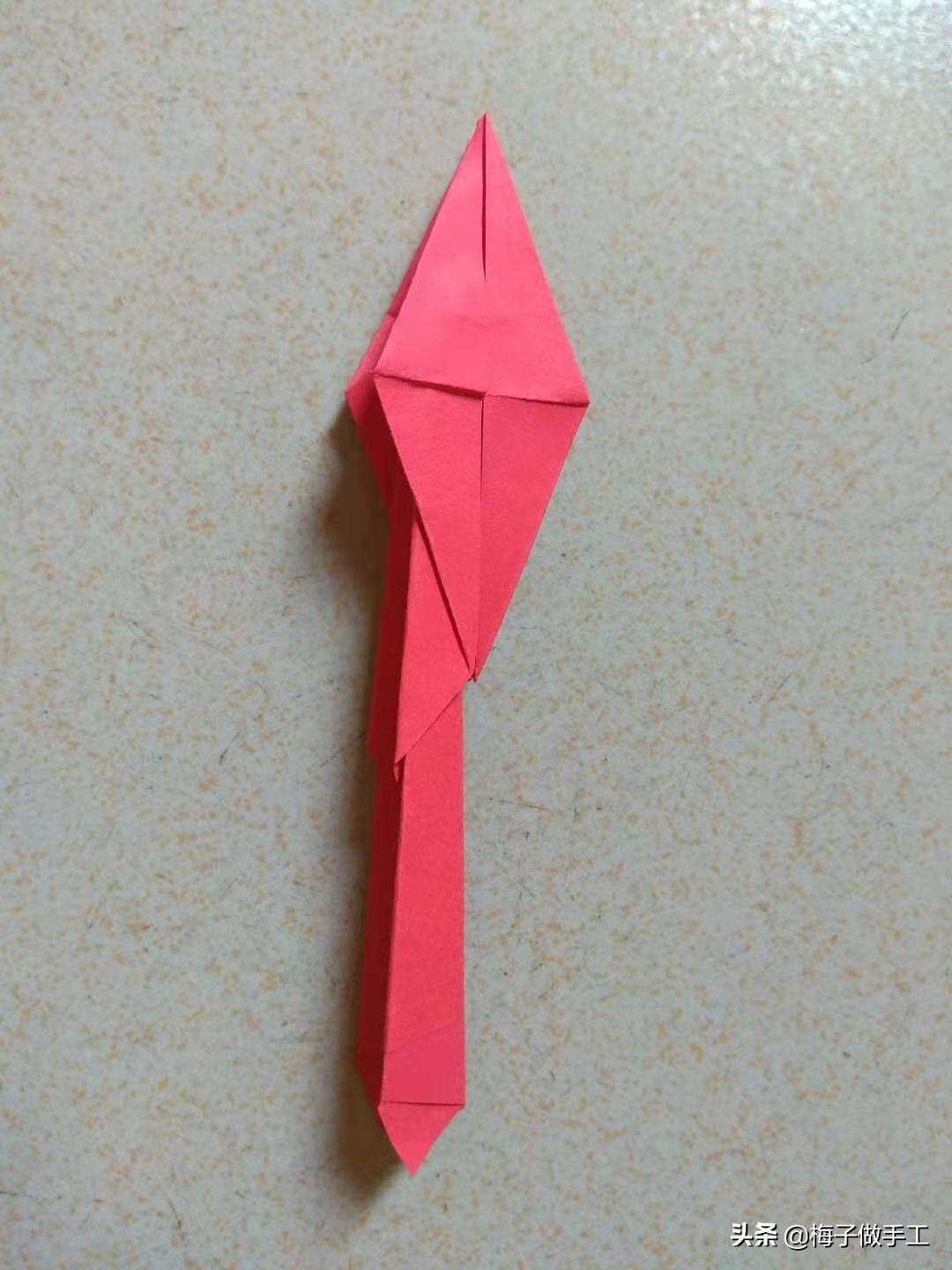 8、把四边菱形左右两个角向中线翻折,另一面也一样折好,然后把中间夹着的短边向上翻折,并把角尖折出凤凰的嘴巴,再把长边向上翻折。(第7步和第8步的折法和折千纸鹤的折法一样)