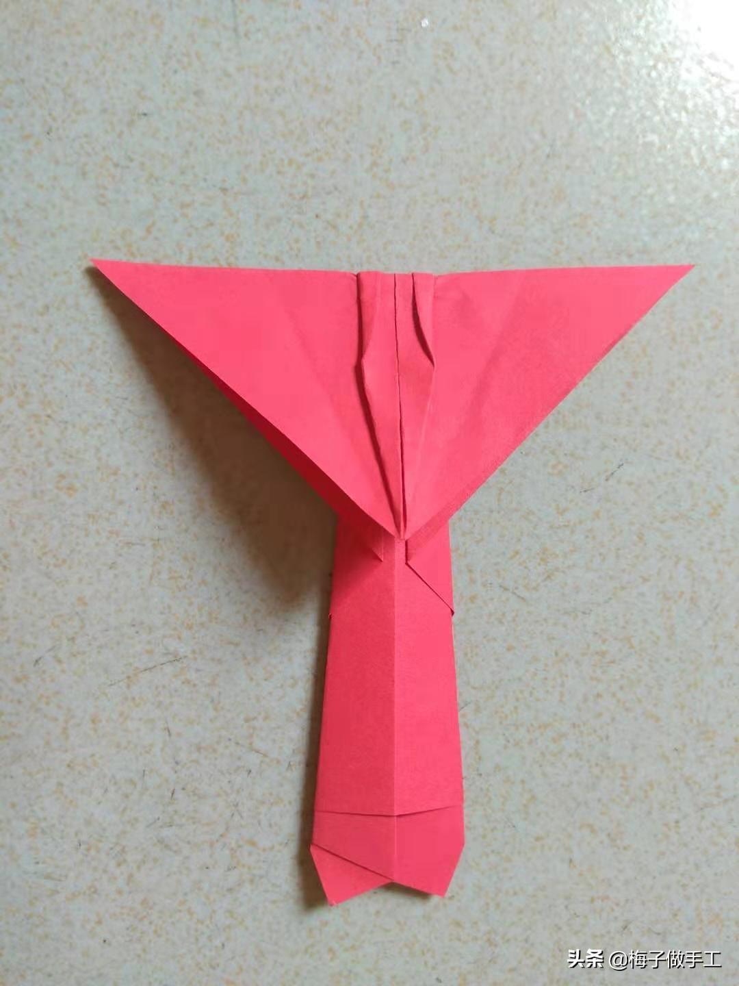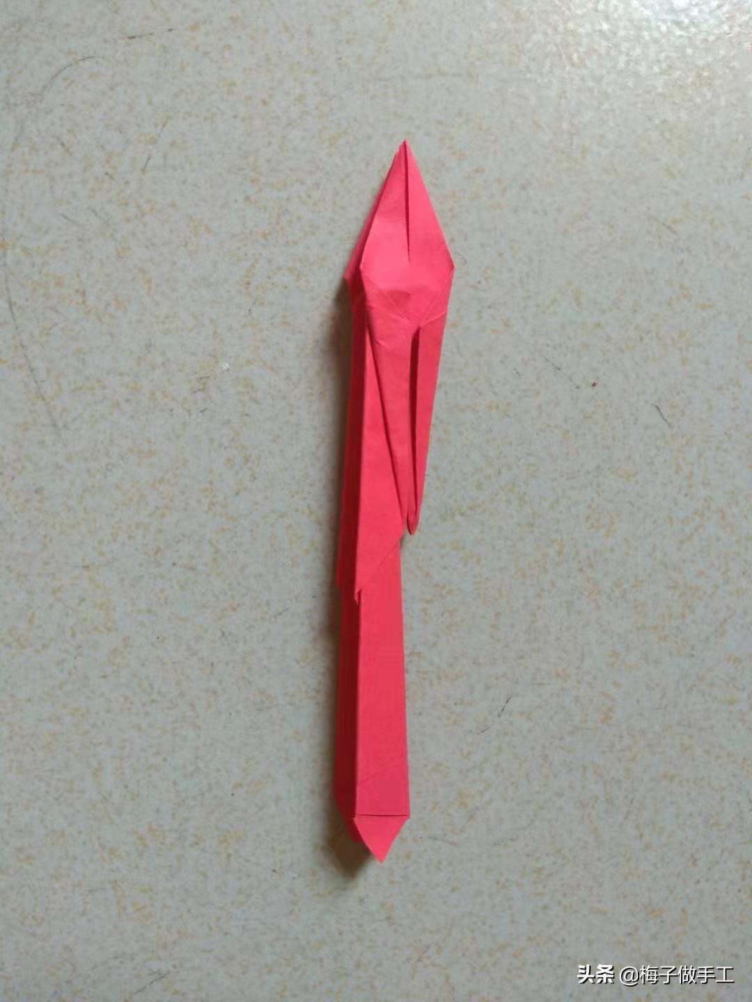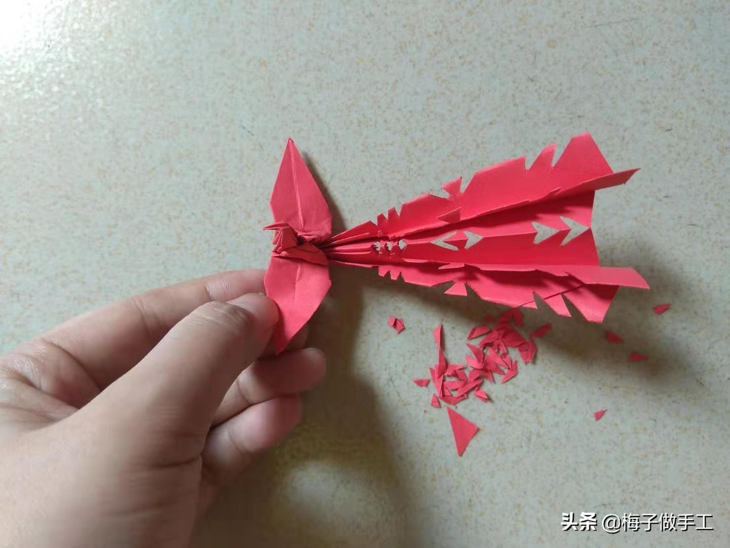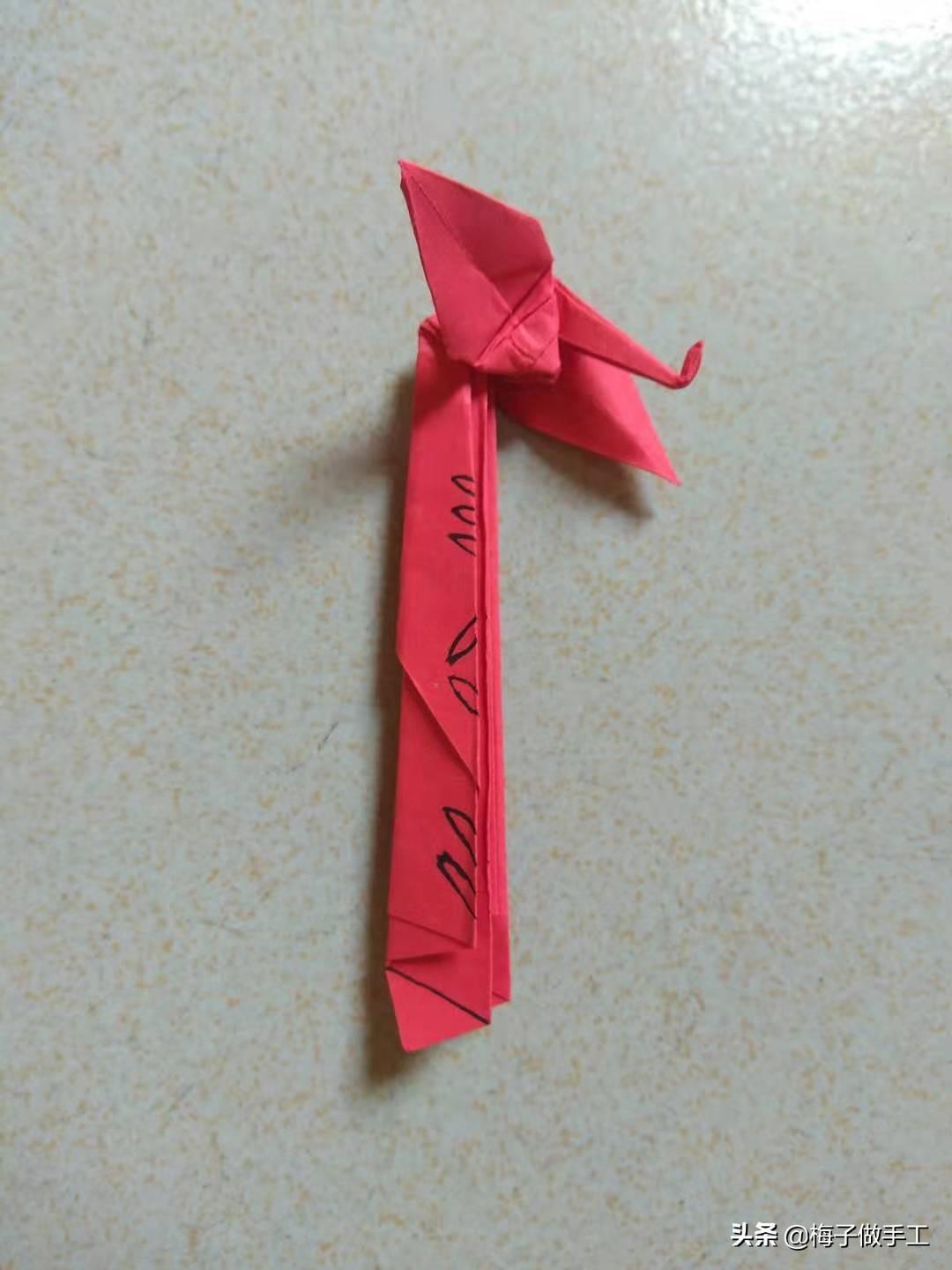 10、用剪刀按照画出的图案来剪,然后把长边打开一些,一只凤凰就折好了。