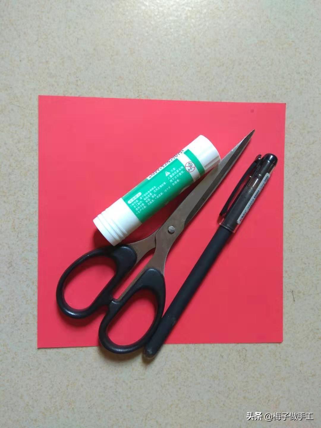 需要准备的材料:一张红色的15cm*15cm正方形纸、剪刀、固体胶、笔